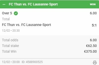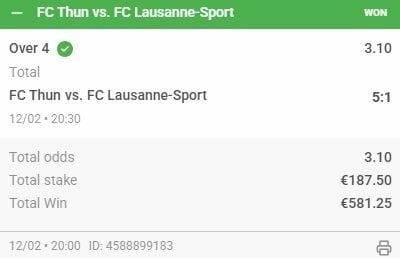 The Swiss Super League is a very good place to go when you're looking for overs, with its relatively high ratio of 4-6 goals matches but I've still managed to hit a real poor, costly run there of late - a matter of being in the right place at the wrong time. Now, with last night's bet coming in thanks to two very late goals - the final one a 94th minute penalty - the curse appears to have been lifted!