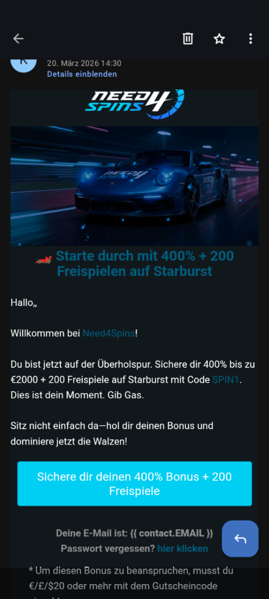 tonino234 Posted 1 hour ago Author Posted 1 hour ago Hello, Welcome to Need4Spins! You're now in the fast lane. Claim a 400% bonus up to €2000 + 200 free spins on Starburst with code SPIN1. This is your moment. Step on the gas. Don't just sit back—claim your bonus and dominate the reels now! Claim your 400% bonus + 200 free spins Your email address is: {{ contact.EMAIL }} Forgot your password? Click here * To claim this bonus, you must deposit €/£/$20 or more using the bonus code. * The maximum bonus amount is €/£/$2000. * Multiple uses: 1 time. * Terms and conditions apply. Imprint: Beauty Products Enterprises, 376 Jefferson Road, Rochester, NY 14623, USA Email: [email protected] Note: In accordance with the legal requirements of Section 7 Paragraph 2 No. 3 of the German Unfair Competition Act (UWG), Beauty Products Enterprises sends this email only with your consent. You can revoke this consent at any time and without giving reasons. The legality of the advertising up to your revocation remains unaffected. Data protection notice: Beauty Products Enterprises is responsible. Contact details above. We process your data for advertising purposes with your consent (Art. 6 Paragraph 1 a, f) GDPR) and store it until you revoke your consent and the expiry of limitation and retention periods. You have the right to information, restriction of processing, objection to processing, and data portability. Unsubscribe Beauty Products Enterprises, 376 Jefferson Road, Rochester, NY 14623, USA Email: [email protected] If you no longer wish to receive newsletters from us, click here: Quote